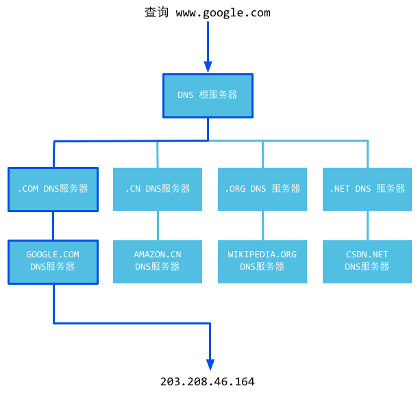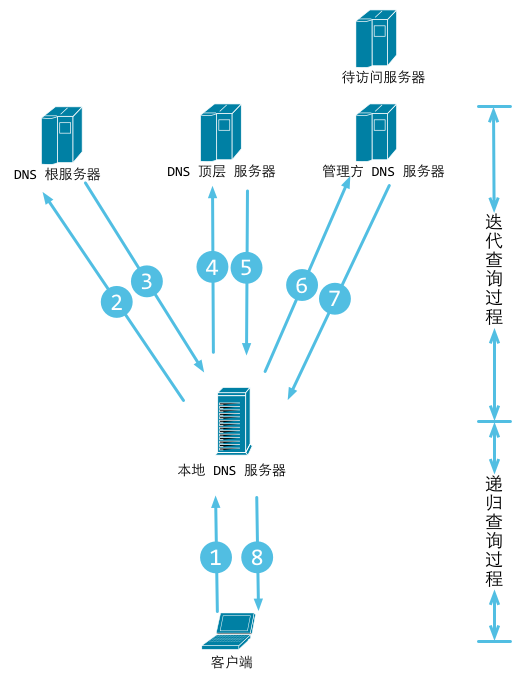 如果本地DNS服务器本地区域文件与缓存解析都失效,则根据本地DNS服务器的设置(是否设置转发器)进行查询,如果未用转发模式,本地DNS就把请求发至 “根DNS服务器”,“根DNS服务器”收到请求后会判断这个域名(.com)是谁来授权管理,并会返回一个负责该顶级域名服务器的一个IP。本地DNS服务器收到IP信息后,将会联系负责.com域的这台服务器。这台负责.com域的服务器收到请求后,如果自己无法解析,它就会找一个管理.com域的下一级DNS服务器地址(qq.com)给本地DNS服务器。当本地DNS服务器收到这个地址后,就会找qq.com域服务器,重复上面的动作,进行查询,直至找到www.qq.com主机。