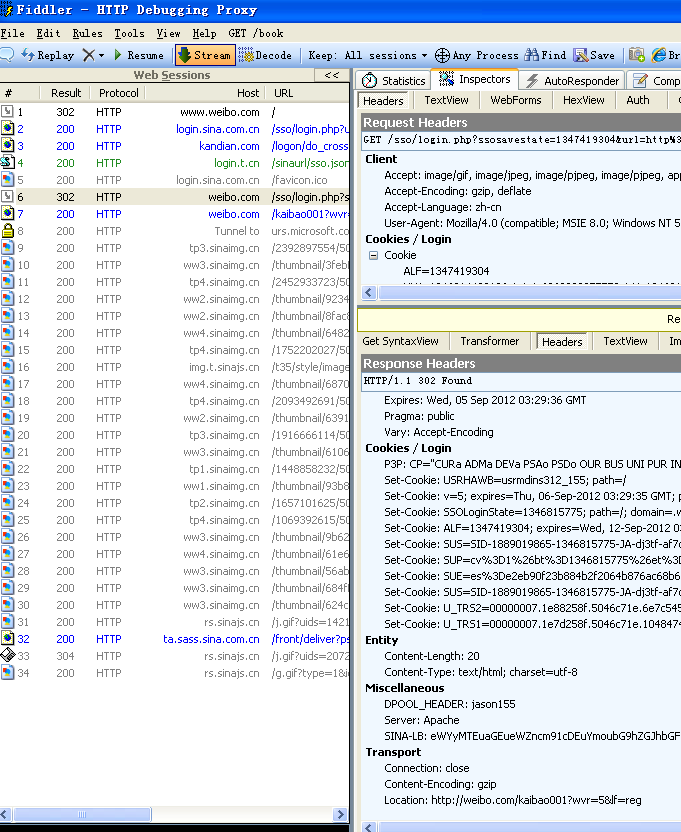 我们看下面这个图展示了详细的返回信息,左边可以看到有很多的资源返回码,200是常用的,表示正常信息,302表示跳转。response header里面展示了详细的信息。