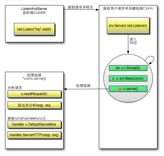 前面小节的代码里面我们可以看到,Go是通过一个函数ListenAndServe