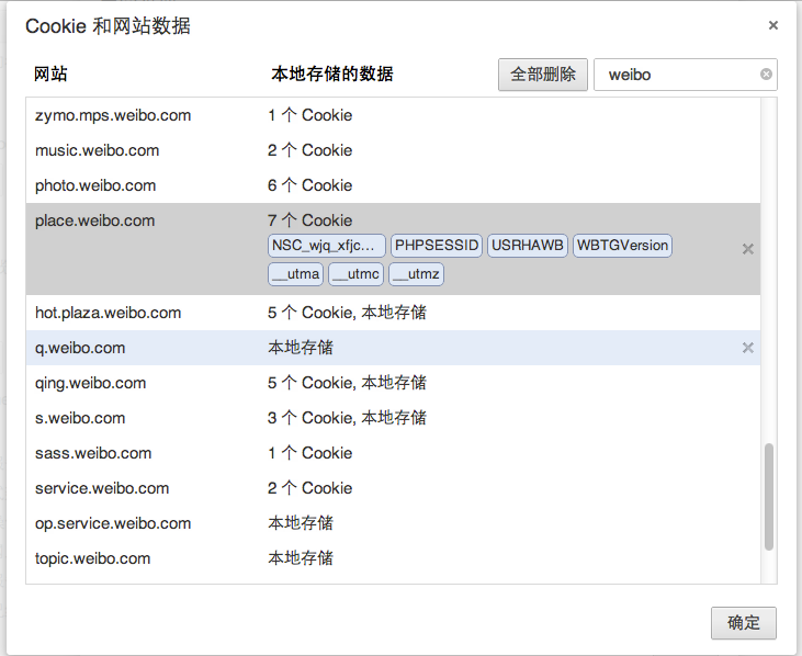 Cookie是由浏览器维持的,存储在客户端的一小段文本信息,伴随着用户请求和页面在Web服务器和浏览器之间传递。用户每次访问站点时,Web应用程序都可以读取cookie包含的信息。浏览器设置里面有cookie隐私数据选项,打开它,可以看到很多已访问网站的cookies,如下图所示:
