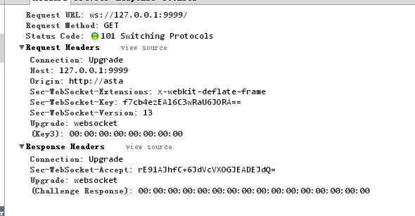 浏览器发出WebSocket连接请求,然后服务器发出回应,然后连接建立成功,这个过程通常称为“握手” (handshaking)。请看下面的请求和反馈信息: