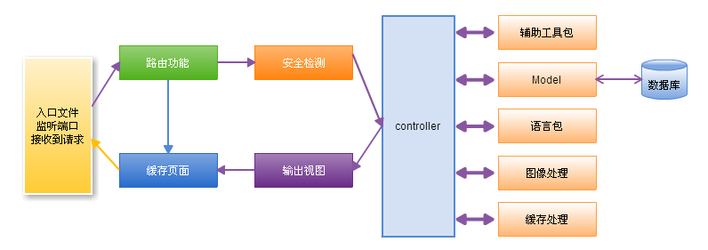 - 控制器装载模型、核心库、辅助函数,以及任何处理特定请求所需的其它资源,控制器主要负责处理业务逻辑。